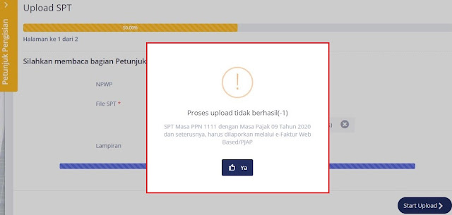 Solusi Gagal Upload DJP Online Untuk masalah proses upload tidak berhasil DJP Online yang satu ini rupanya tidak hanya menunggu server agak longgar saja, tetapi Anda harus membuka setiap lampiran SPT yang ada pada e-faktur, mulai dari lampiran A1 hinggga 1111AB. Hal tersebut dilakukan sebelum membuat file CSV SPT Masa PPN 1111. Pelaporan SPT Tahunan bisa secara online melalui aplikasi e-filing di DJP Online. Namun, ada kalanya wajib pajak terkendala teknis saat melaporkan SPT Tahunannya. Misalnya, muncul eror dengan notifikasi 'ERR099: Proses tidak berhasil dilakukan' pada aplikasi e-filing. Lantas bagaimana solusinya jika notifikasi eror tersebut muncul?